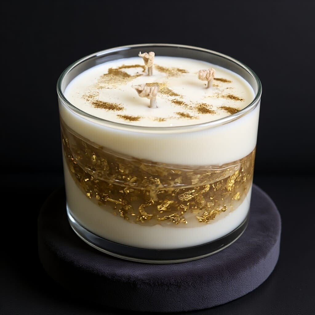 Das Besondere: Eine gläserne Schicht aus echten Goldflakes, die im warmen Kerzenlicht wunderschön schimmert und ein Gefühl von Eleganz und Geborgenheit schafft.